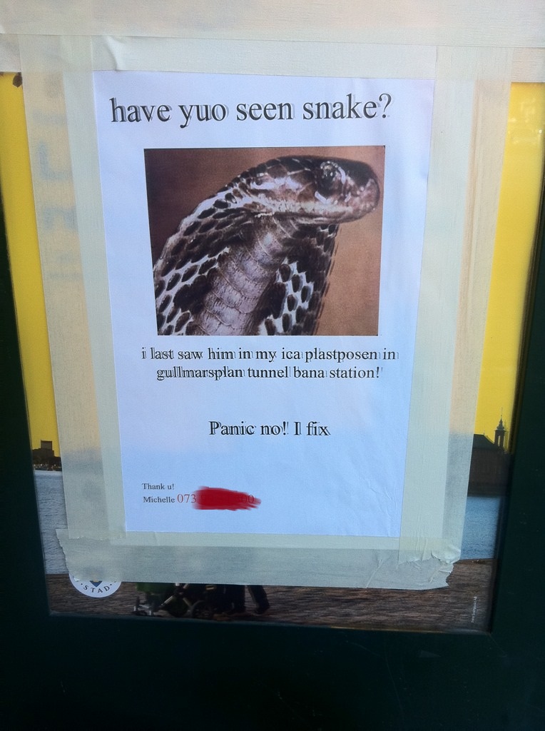 Till affischörens försvar kan jag också tillägga att skylten bakom lappen har budskapet ”Låt gatorna vara rena och fimpfria – på väg mot ett Stockholm i världsklass”. När jag gick förbi samma skylt (utan ormlapp) på väg hem från jobbet såg sprutnarkomanerna på busshållplatsbänken ut att vara helt skakade av rörelse inför stadens vackra vision.