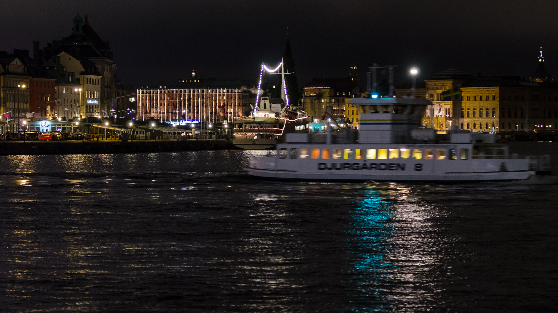 Djurgårdsbåt framför Strandvägen – observera LED-hysterin på Grand Hotel